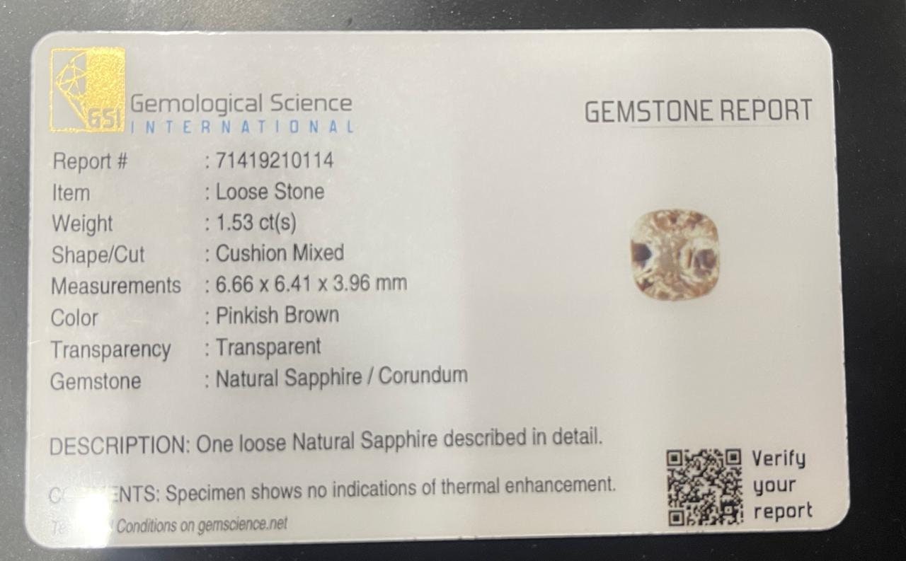 certified by GSI natural unheated peach sapphire cushion cut faceted loose gemstone 1.53 carat for jewelry making, september birthstone -