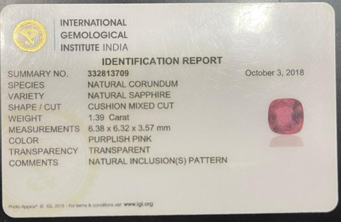 IGI certified natural purplish pink sapphire cushion cut faceted loose gemstone 1.39 carat for jewelry making, september birthstone -