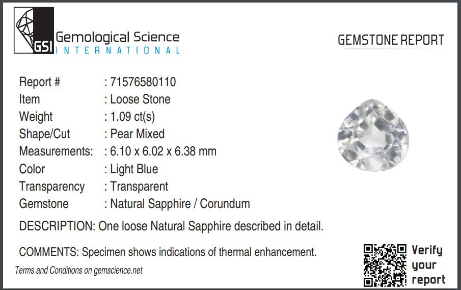 certified by GSI natural blue tint white sapphire pear cut faceted loose gemstone Ceylon 1.09 carat for jewelry making, september birthstone -