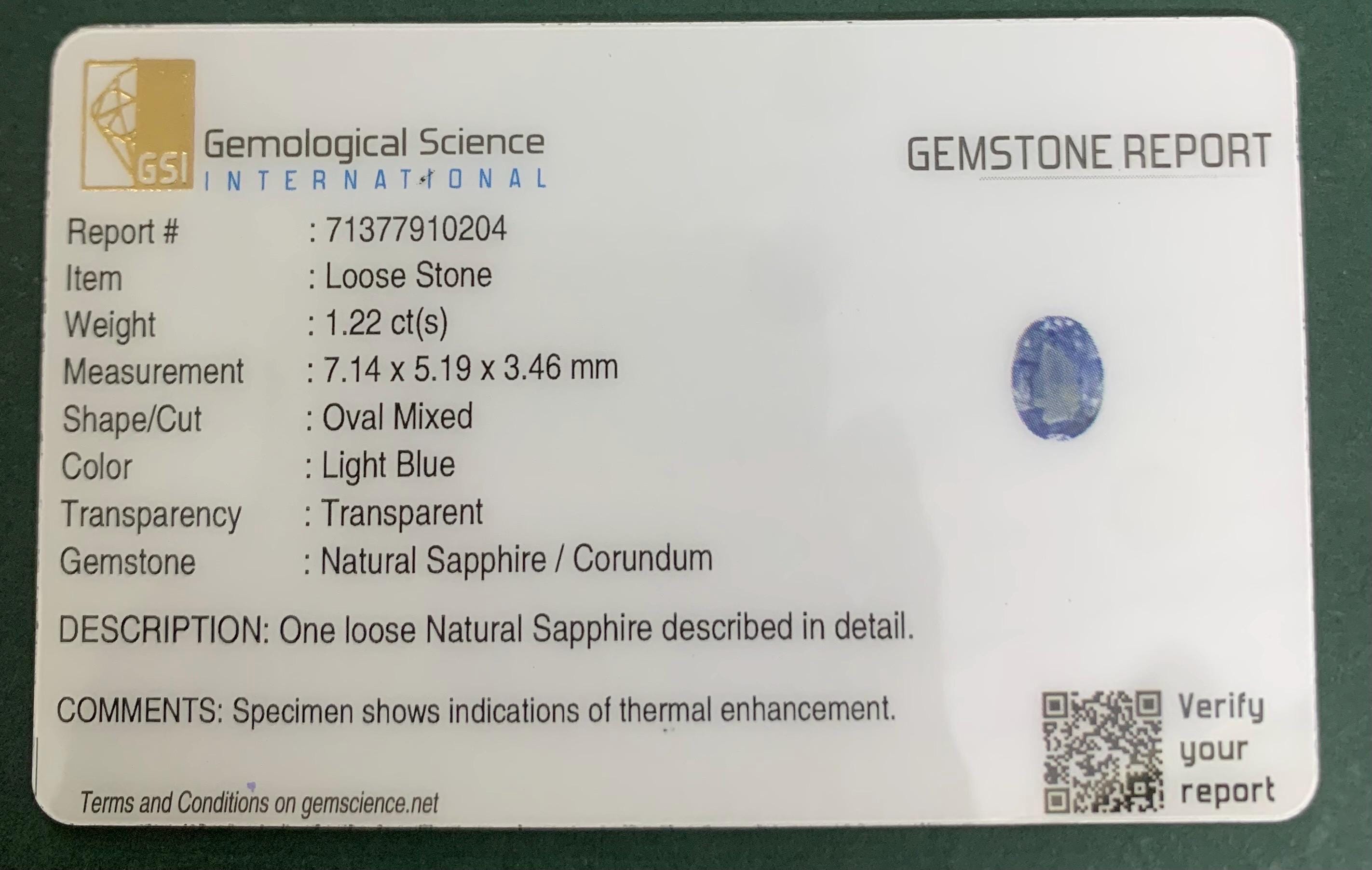 GSI Certified Natural Pastel Blue Sapphire | Oval Cut Faceted Loose Gemstone | 1.22 Carat for Jewelry Making | September Birthstone -