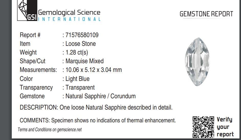Certified by GSI natural unheated White Sapphire marquise cut loose gemstone 1.28 Ct, September birthstone jewelry making engagement ring -