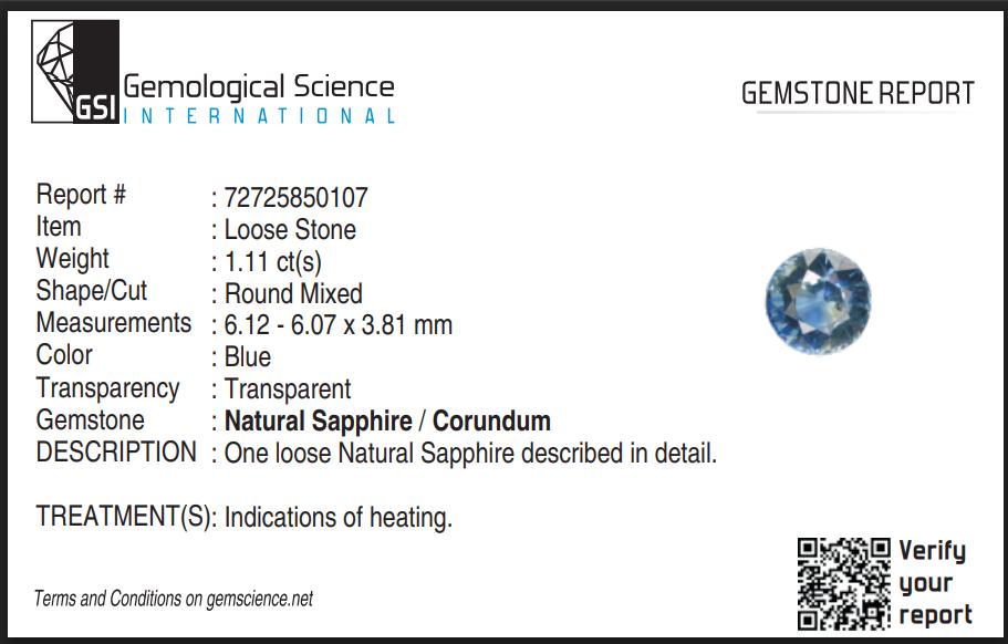 GSI Certified natural blue teal sapphire round cut faceted loose gemstone 1.11 carat for jewelry making, September birthstone for engagement ring -