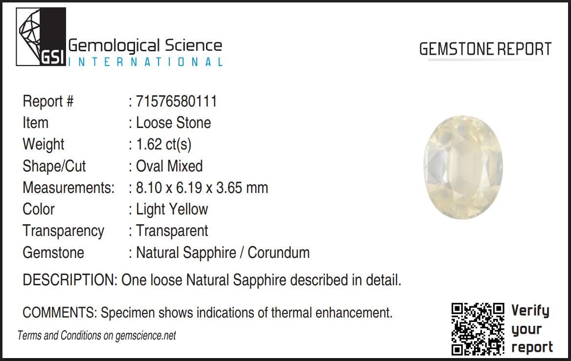 certified by GSI natural Pastel Yellowish White sapphire oval cut faceted loose gemstone 1.62 carat for jewelry making, september birthstone -
