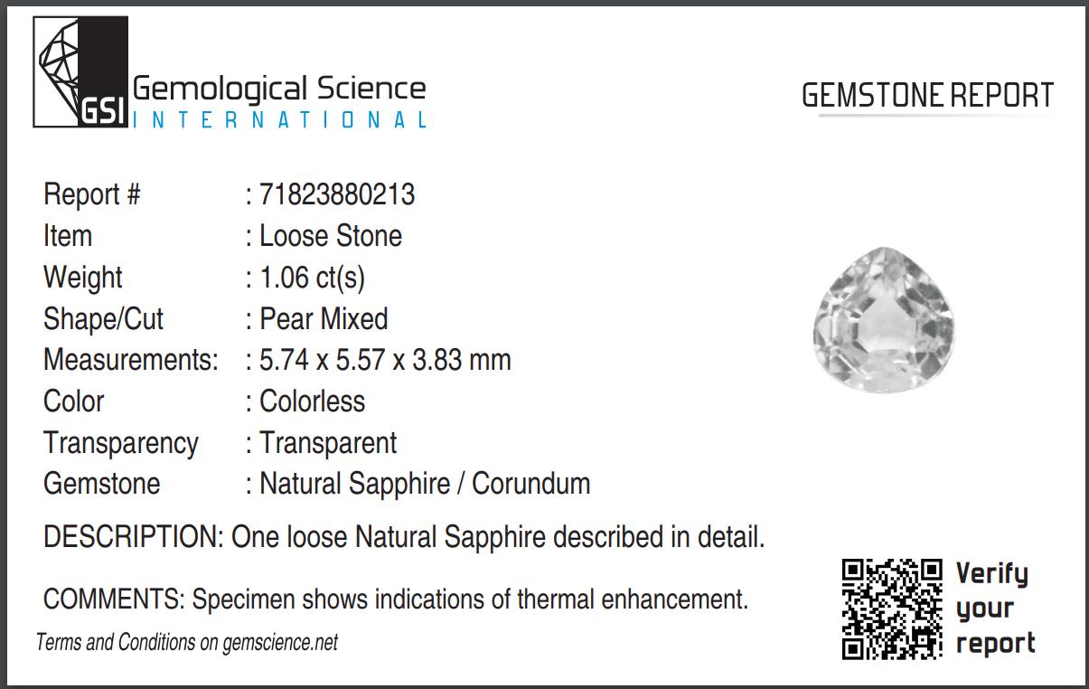 certified by GSI natural white sapphire pear cut faceted loose gemstone 1.12 carat for jewelry making, september birthstone -
