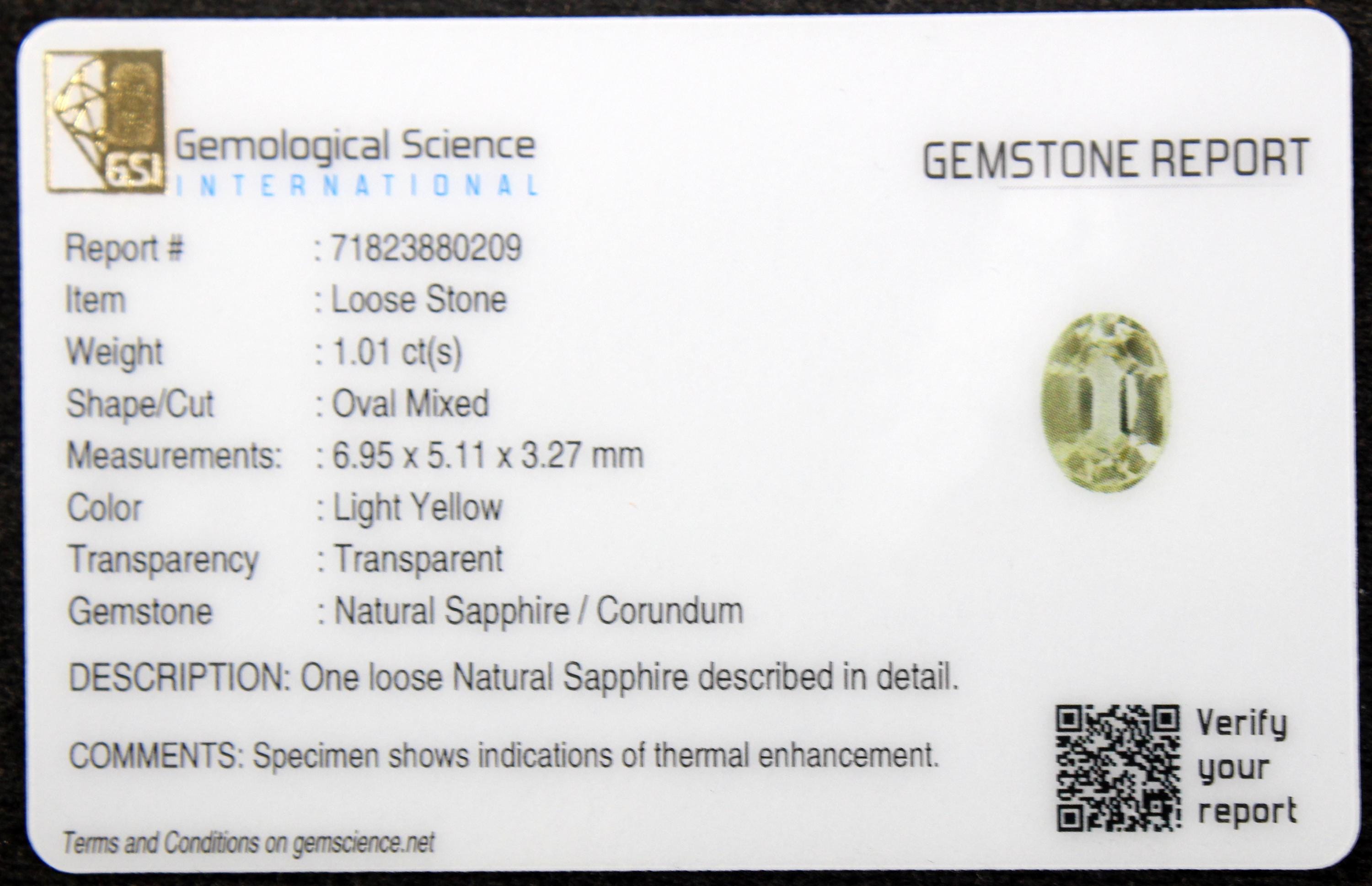 Certified natural pastel yellow sapphire oval cut faceted loose gemstone 1.01 carat for jewelry making, September birthstone -