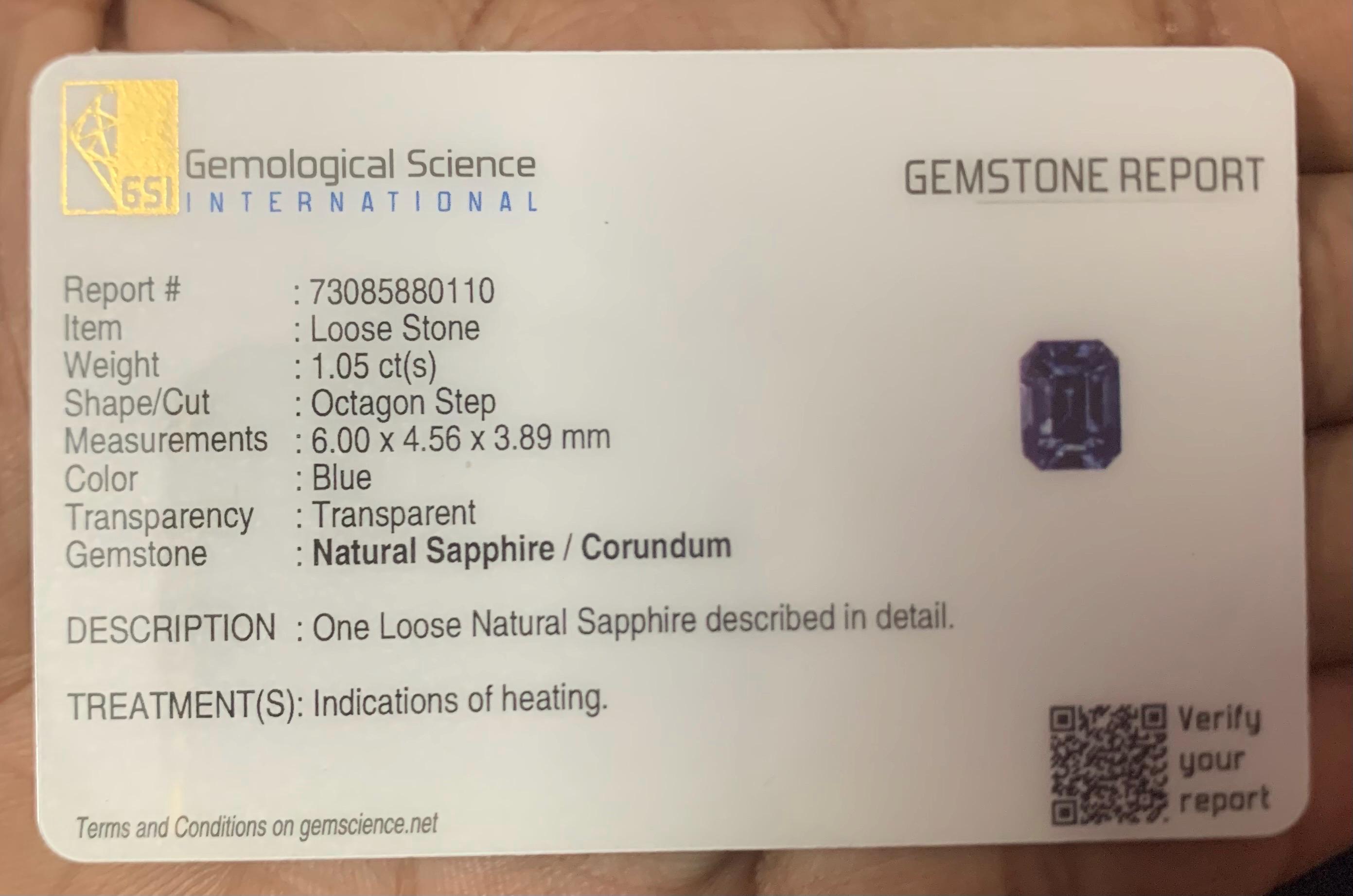 Certified by GSI Natural Blue Sapphire Octagon Emerald Cut Faceted Loose Gemstone 1.05 Carat September birthstone, Engagement Ring-