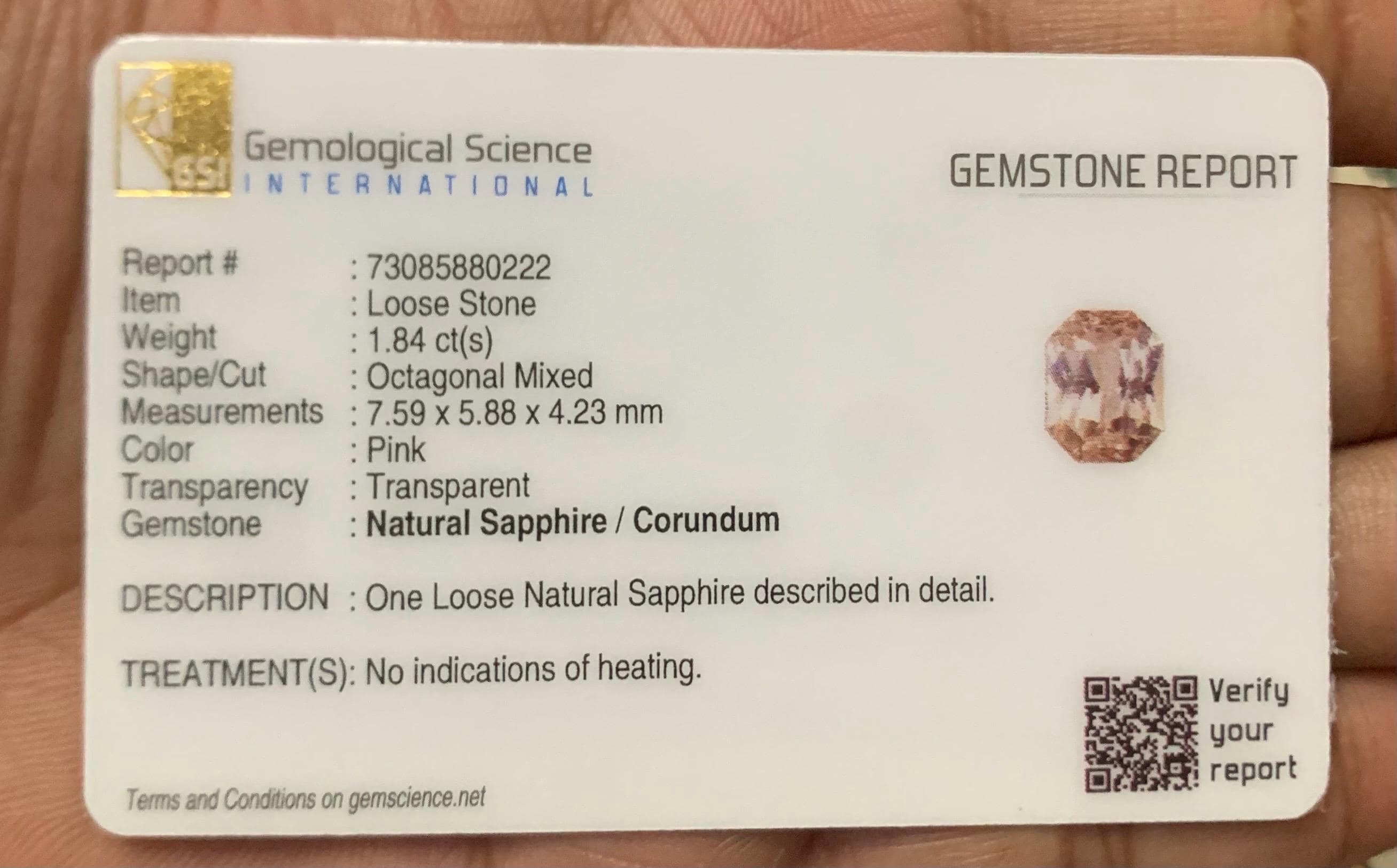 GSI Certified Natural Pink Sapphire Emerald Cut Faceted Loose Gemstone 1.84 Carat September Birthstone, Engagement Ring-