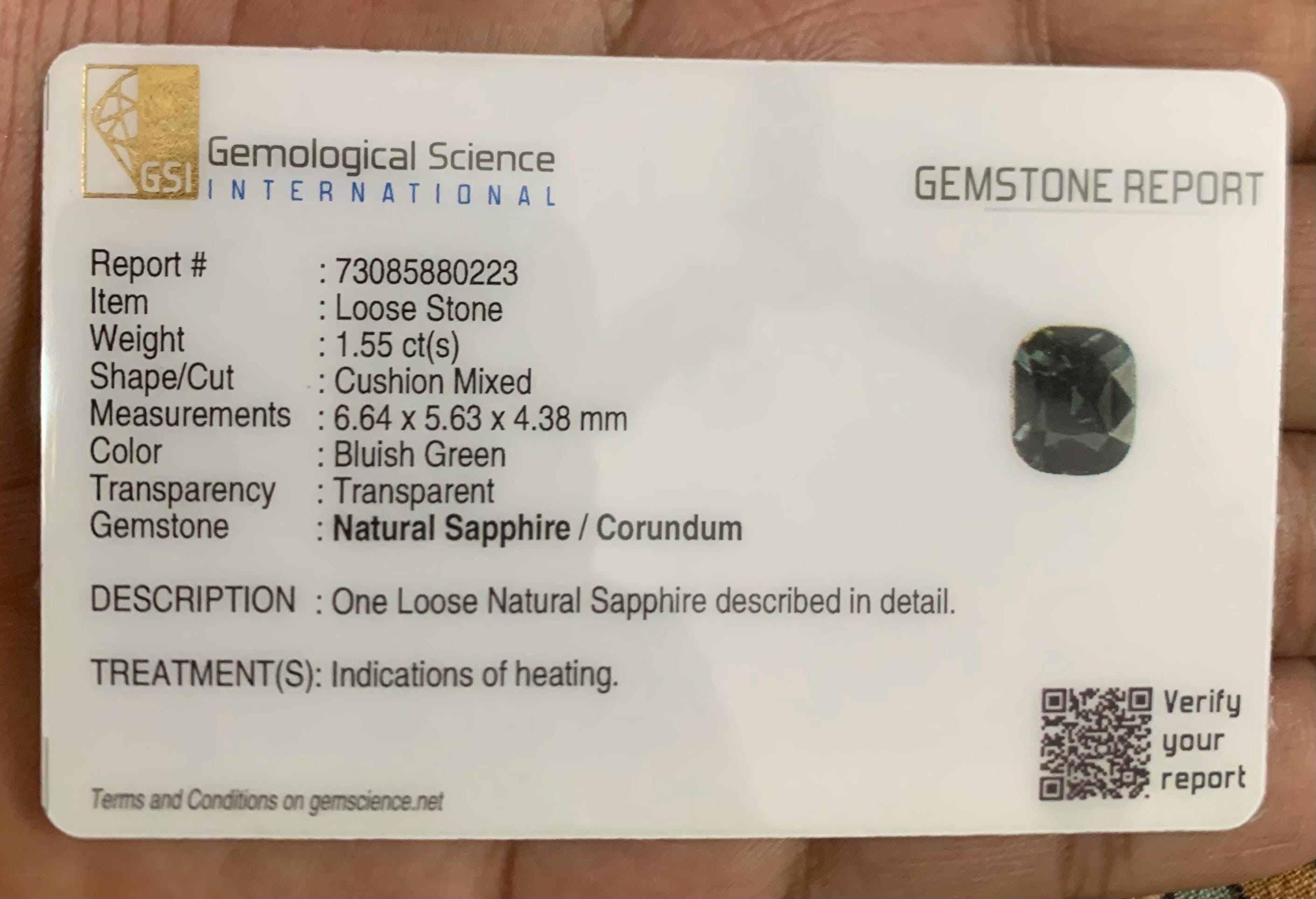 Certified Teal Sapphire 1.55 Carat Cushion Cut Gemstone, Engagement Ring -