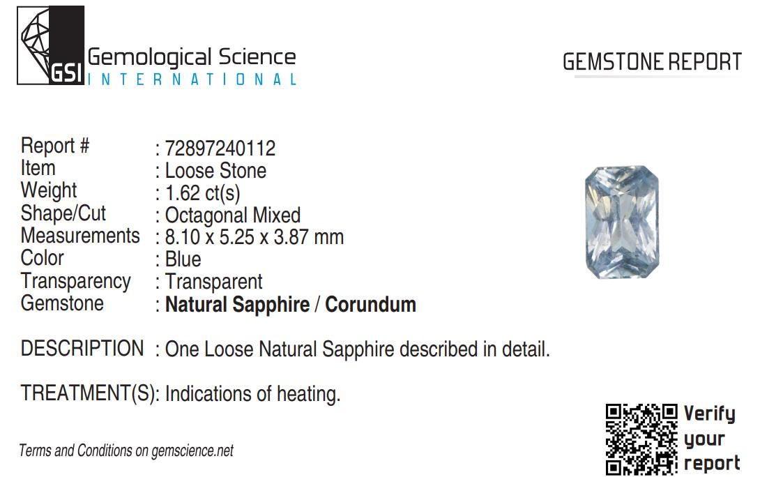 GSI Certified Natural Blue Sapphire Octagon Cut Faceted Loose Gemstone 1.62 Carats, September Birthstone for Engagement Ring -