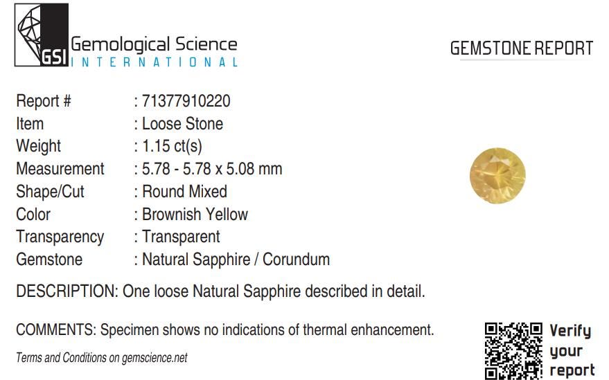 This listing is about a gorgeous Yellow Sapphire with a round cut. It weighs 1.15 ct and its origin is Madagascar. This Sapphire is a beautiful yellow color with a brownish hue. It is certified by the globally known lab GSI, which confirms that it is an unheated and untreated sapphire.