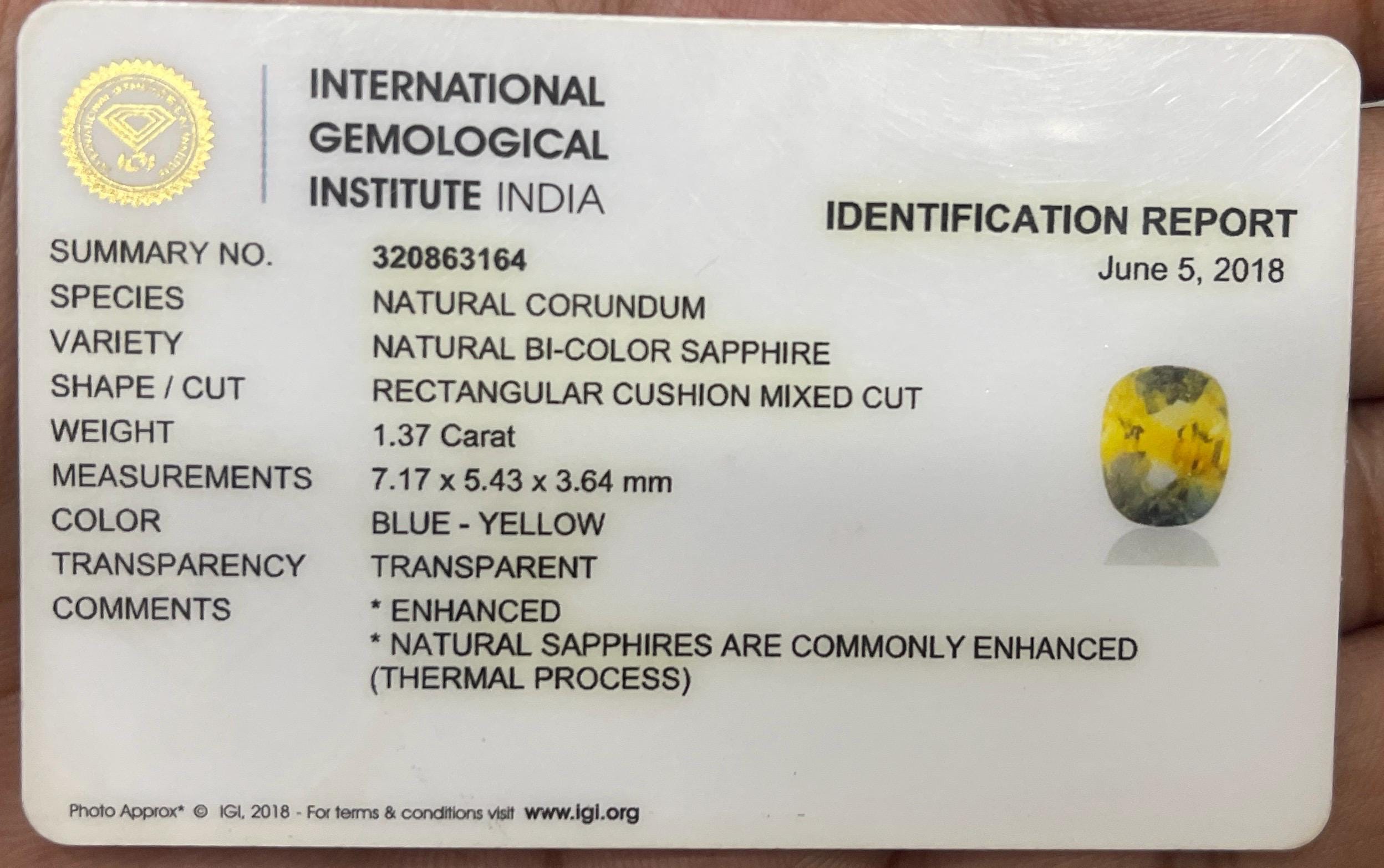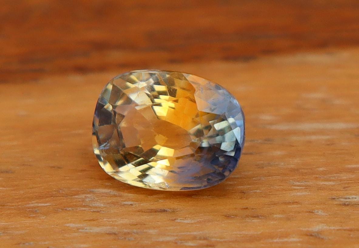 Certified Natural Bi-Color Sapphire Gemstone: 1.37 Carat Blue-Yellow Rectangular Cushion Cut, Engagement Ring -