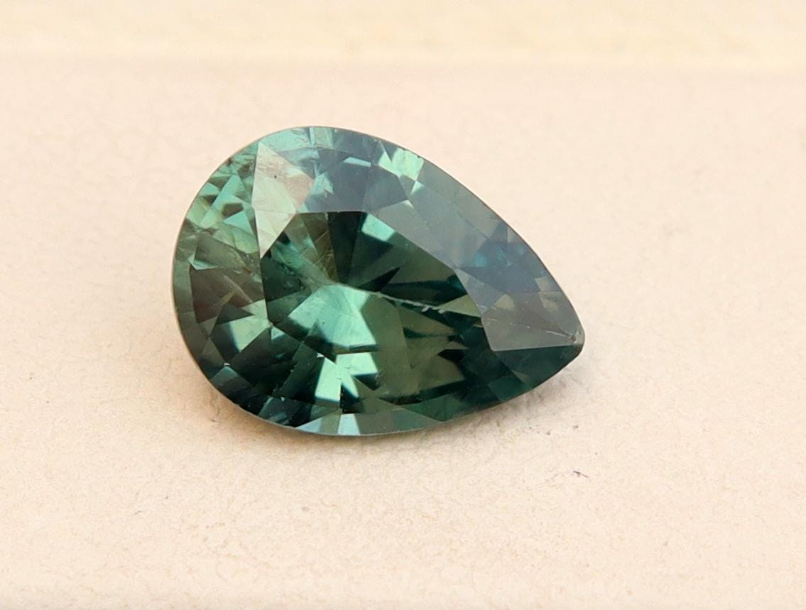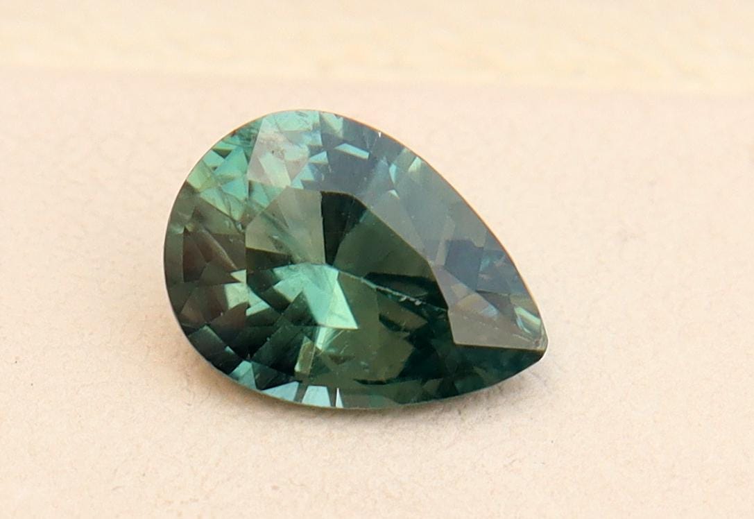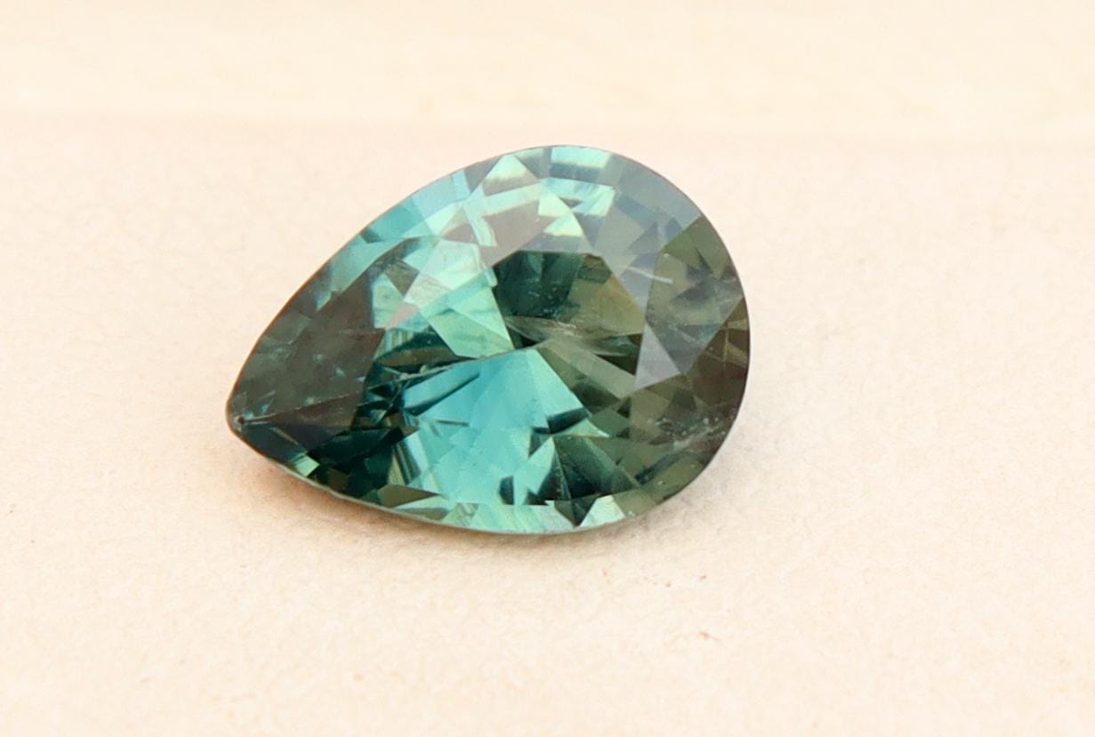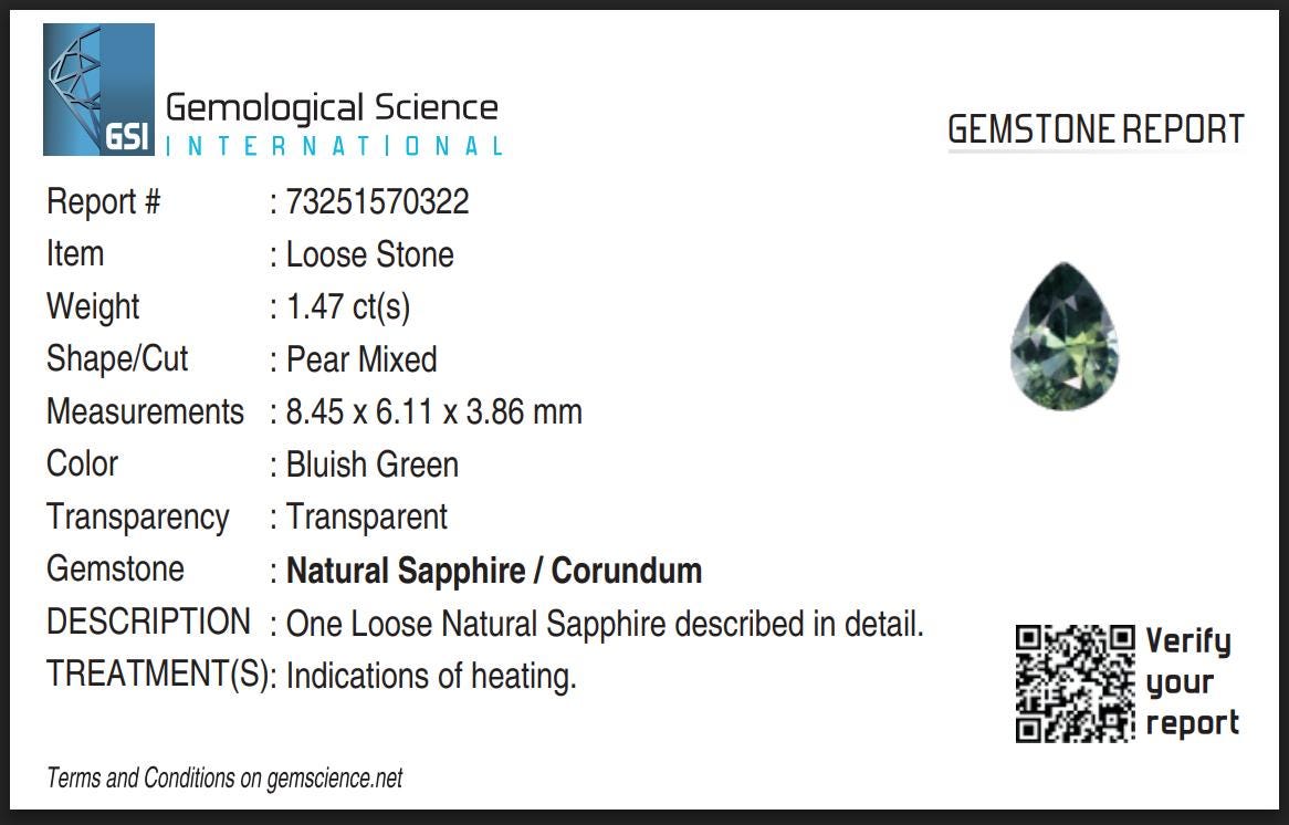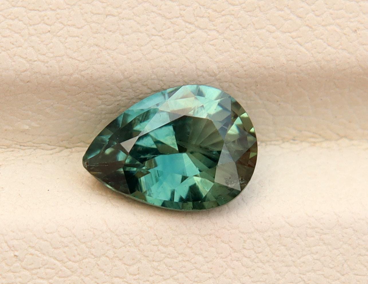 GSI Certified Green Teal Sapphire: 1.47 Carat Pear Cut Gemstone, Engagement Ring -