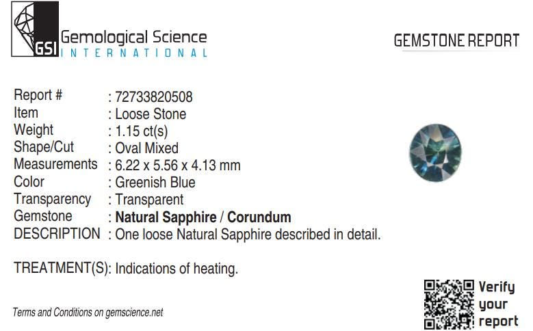 GSI Certified Greenish Blue Teal Sapphire 1.15 Carat Oval Cut Gemstone, Engagement Ring -