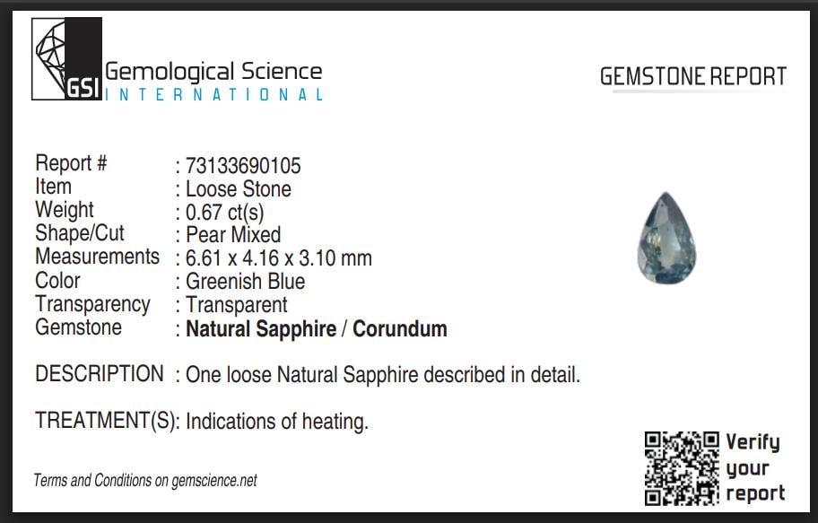 GSI Certified Blue Teal Sapphire: 0.67 Carat Pear Cut Gemstone, Engagement Ring -